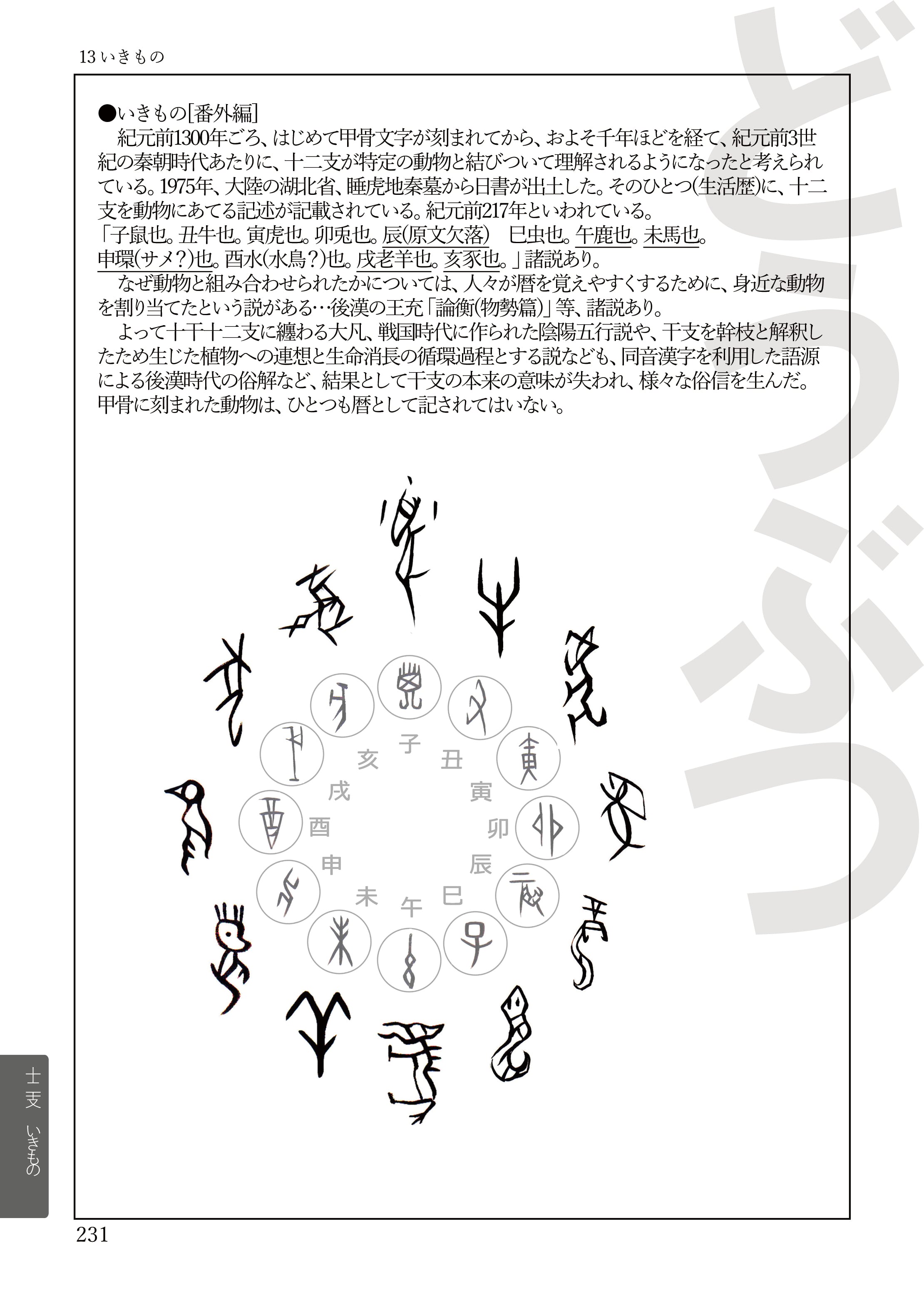 十二支が現在のような動物(子=鼠など)と結びついたのは、甲骨文誕生から約千年後、紀元前3世紀の秦代(睡虎地秦墓から出土した竹簡「日書」)と言われています。本書では、その歴史的背景にも触れながら、動物という概念に固定される前の「目に見えない発想の根源」を追い求めます。